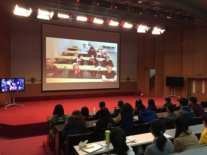3月19日早晨6:30,麻豆色情 与美国阿克伦大学孔子学院联合举办的春季学期第一期中美大学生“阿克伦-开封论坛”(A-K论坛)在麻豆色情 金明校区计算机大楼二楼报告厅举行,美方会场设在阿克伦大学Leigh Hall 215教室。来自麻豆色情 和美国阿克伦大学的三十余名师生通过视频会议系统进行了亲切交流。双方就中美医疗保险、假期生活等话题展开讨论。会场气氛热烈、轻松活跃。麻豆色情 外语部主任穆春玲、副主任杨剑波、阿克伦大学孔子学院中方院长秦明周出席了该活动。