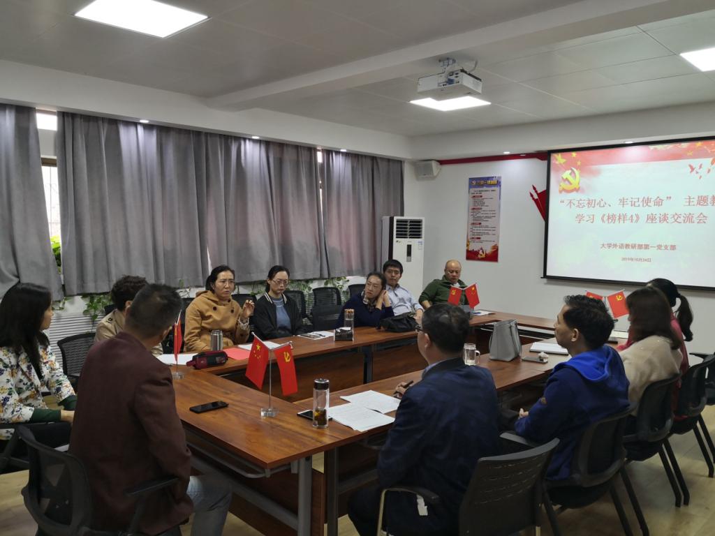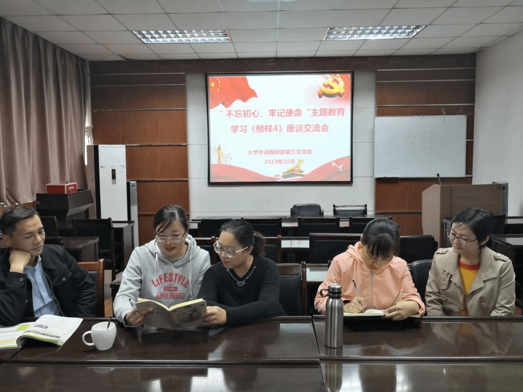 在外语部二楼小会议室,第二党支部书记张聪沛同志带领大家回顾了《榜样4》中优秀共产党员们的先进事迹。支部党员们结合自身工作、生活的实际,就如何践行奉献精神,立足岗位,汲取先进典型身上的优秀品质交流了各自的心得体会。榜样们的先进事迹深深鼓舞并激励着每位党员,通过学习榜样事迹与精神,进一步加深了同志们对“不忘初心、牢记使命”的理解和认识。榜样无处不在,学习榜样,在于领悟,更在于践行。