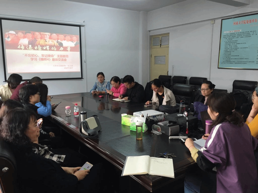 在外语部一楼会议室内,第三党支部杨霞书记带领党员同志结合工作实际,开展了深入讨论,分享了学习心得。通过党员依次发言、典型事迹再现等形式,用先进事迹诠释了党的崇高理想,引发了支部党员同志们以榜样为力量 、甘于奉献的工作热情。杨霞同志总结和肯定了本次座谈会的学习效果,并对大家提出了希望:党员同志应该在平凡的工作岗位上“不忘初心、牢记使命”,为党分忧,为民担当。