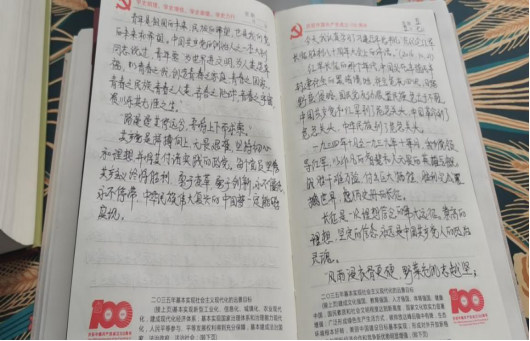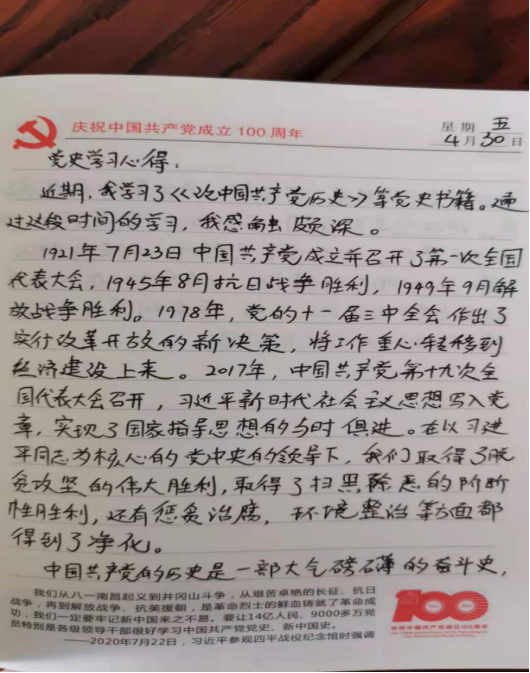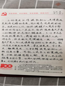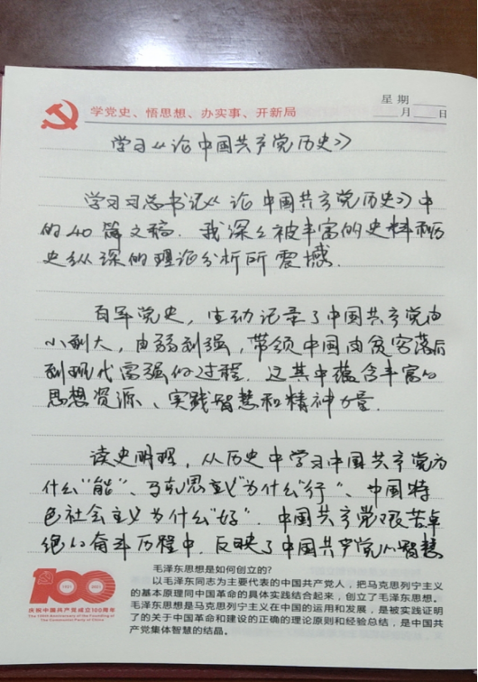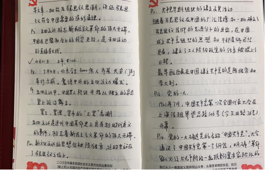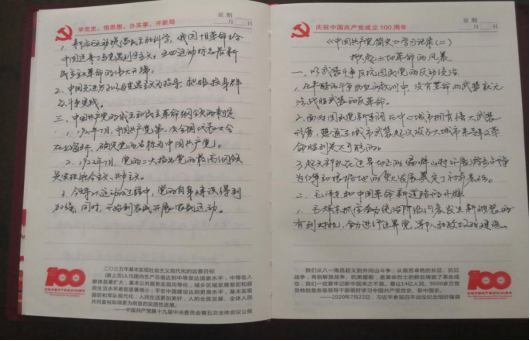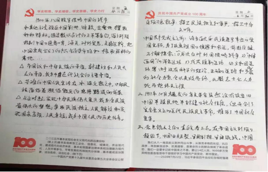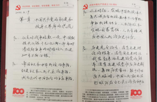 党史学习教育开展之初,外语部党总支便为全体党员提供了习近平总书记《论中国共产党历史》《毛泽东、邓小平、江泽民、胡锦涛关于中国共产党历史论述摘编》《习近平新时代中国特色社会主义思想学习问答》《简明河南党史》等学习材料,确保党员学习材料全覆盖。外语部党员同志以积极的态度与饱满的热情投入党史学习教育,学习氛围浓厚,接下来让我们一起看一看他们的学习笔记和心得。