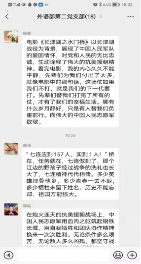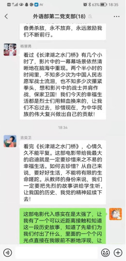 观影结束后,大家感慨万分,迫不及待地交流了所感所悟。杨慧勇同志激动地说:“我们不是生活在一个和平的年代,而是生活在一个和平的国家。我们今天的幸福生活,都是先辈的血肉铸成的。我们一定要铭记历史,缅怀先烈,发扬革命先辈奉献精神!”徐睿同志也表示“何其有幸生在红旗下,我们要珍惜当下来之不易的幸福生活,立足本职,恪尽职守,在新的学期里以更加昂扬的斗志,更加饱满的热情,投入到教科研工作中,为祖国教育事业的发展贡献力量!”
