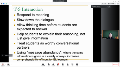 杨教授还聚焦教师的指导和学生的学习两个方面,剖析社会文化理论对外语教学的启示作用。杨教授指出,教师课堂话语应该打破传统的IRE话语结构,通过恰当的课堂话语,充分发挥支架作用,引发学生进行探究,创造空间让学生进行自我表达。杨教授还同时强调了课堂合作学习和发挥同伴支架作用的重要性。