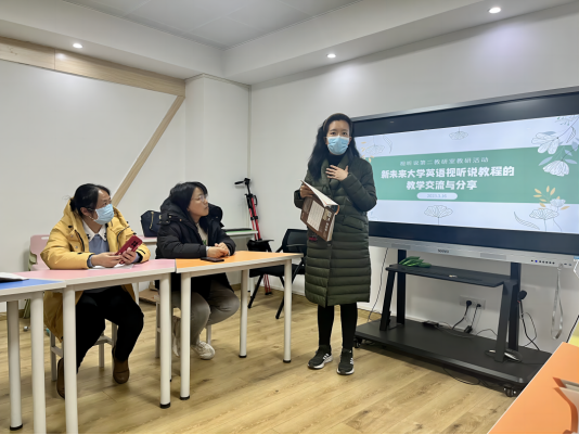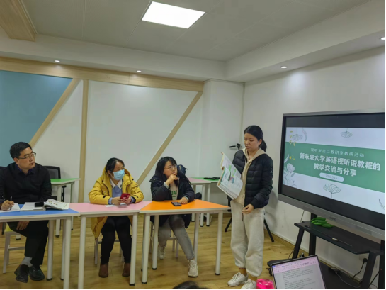 本次研讨会以新教材《新未来大学英语视听说》作为重点,结合大家一个学期以来的教学实践情况,彼此分享教学经验智慧,共同探讨攻克教学难题。会议开始之前,教研室全体教师分为三组进行了充分讨论和准备,并推选了发言代表。首先,石慧老师代表第一小组分享了丰富多彩的口语教学活动。他们认为,演讲活动话题应贴近学生生活,引起学生的参与兴趣;辩论要充分利用学生的自主性,话题设定让学生自主协商,辩论结束时让学生发问和点评。同时,口语活动的形式应尽量多元化,采用单人练习、双人对练、小组讨论、大班汇报等多种形式,照顾到不同学生的性格和需求。最为重要的是,视听说课堂要于无声处做好课程思政,例如,通过“perfect body”这一话题,引导学生明辨是非,提升批判思维能力,树立正确的健康观;通过讨论“人与自然”,鼓励大学生积极传承“天人合一”这一中国传统文化的思想精华,激发大学生作为新时代青年应有的责任担当意识,自觉保护环境,尊重自然,与自然和谐相处。