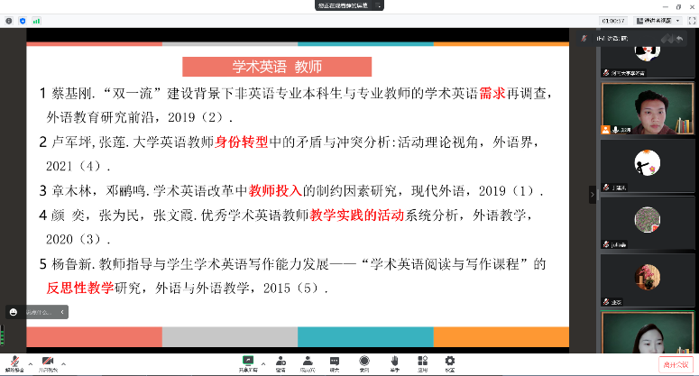 薛丽娜老师结合自身兴趣,选取了5篇学术英语教学相关论文,从研究视角、研究问题、研究方法、研究结果和问题改进等方面进行了详细分析。汇报过后,大家就国际期刊检索、论文资源下载、citespace使用、spss安装等问题进行了交流。近两个小时的分享活动让大家感觉干货满满、收获颇丰。
