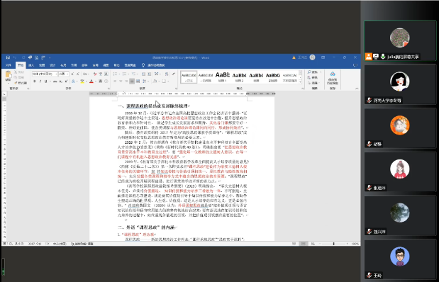 外语教学方法与实践论文共读小组由姜晓娜老师领读。分享活动中,姜晓娜、胡静、张聪沛、刘兴沛、王玲、李冬青老师围绕外语课程思政主题,结合阅读张敬源、王娜在《中国外语》两篇刊文的收获分别做汇报。他们从党建、教学、科研等不同视角分享了自己的认识和思考,并就思政素材挖掘、课程思政实施原则和方法、思政教学评价方式、外语课程思政研究设计等问题进行了讨论和交流。