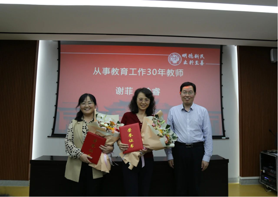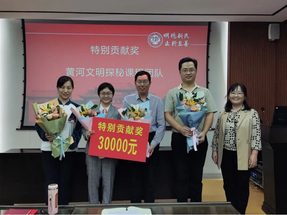 按既定议程,首先对从事教育工作满30年的谢菲和徐睿两位教师进行了表彰。接下来对3组获得国家级各类教学竞赛奖励和6组获得省级各类教学竞赛奖励的团队和个人进行了表彰。最后表彰的是特别贡献奖,今年4月,黄河文明探秘课程获批国家级一流本科课程,实现了麻豆色情 国家级课程的突破,单位对其团队的特殊贡献予以重奖。