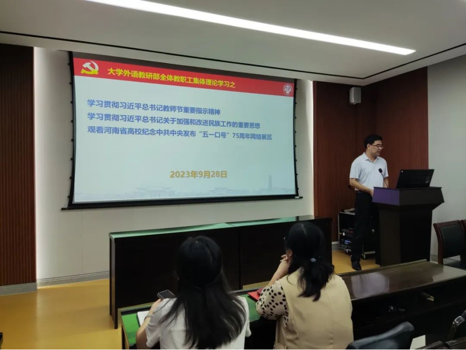 表彰会后,全体教职工进行了集体理论学习。蒋框带领全体教师学习了习近平总书记教师节重要指示精神和习近平总书记关于加强和改进民族工作的重要思想,并组织观看了河南省高校纪念中共中央发布“五一口号”75周年网络展览。
