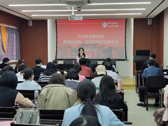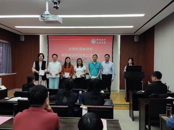 部党委书记、主任杨剑波为科研团队以及教科研培育项目立项教师颁发经费卡。科研团队分别为郭云仙“积极心理学与外语教学界面研究”团队,刘亚杰“翻译与跨文化研究”团队。教科研培育项目立项教师分别是郭云仙“中澳新历史小说历史观比较研究”、李冬青“ChatGPT类大语言模型赋能大学外语教学路径研究”、李恩光“情境植入视角下汉英肯定祈使句的认知对比研究”、曲捷“新学科背景下大学英语教师身份认同研究”、郑玮“‘双一流’高校学生外语学习愉悦情绪调控研究——积极心理学视角”。