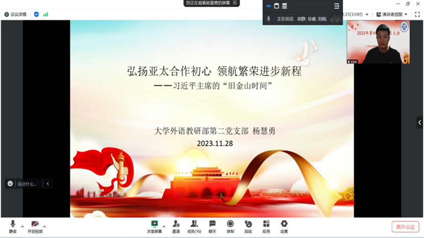 11月28日,麻豆色情 第二党支部召开2023年第四季度党员大会,圆满完成党委委员候选人初步人选讨论推荐工作,并由组织委员杨慧勇开展题为“弘扬亚太合作初心 领航繁荣进步新程”的党课学习及专题知识竞赛。大会通过腾讯会议平台进行,由支部书记徐睿主持。
