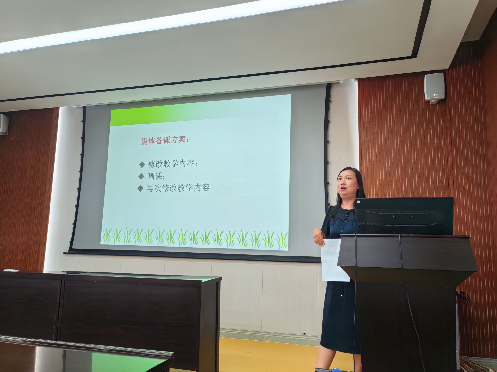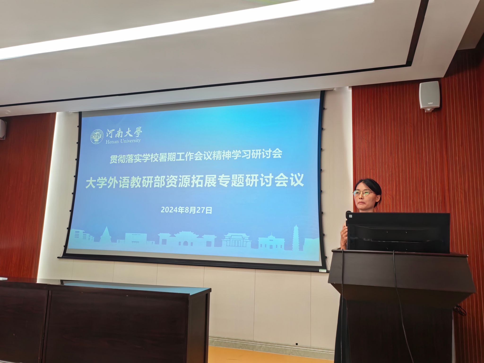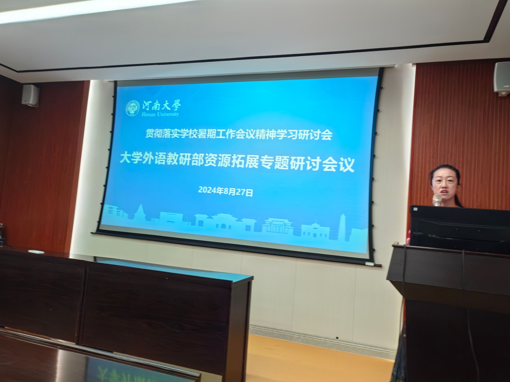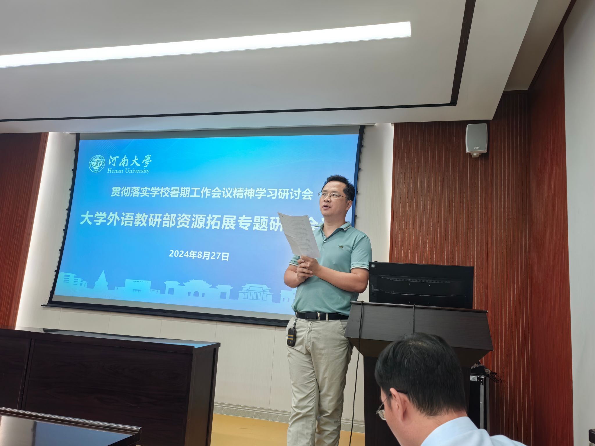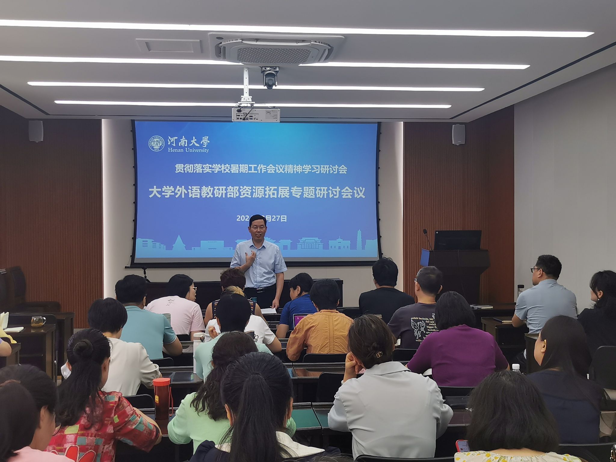 部党委副书记、副主任蒋框传达了学校暑期工作会议精神,并介绍我部目前资源拓展情况以及存在问题。对进一步做好我部英语培训工作,蒋框提出:一要更新课程,各课程团队要积极外出培训,接收新知识。二要提高质量,完善课程考核机制。三要开展线上课程,探索新方式。四要高度重视,全体人员都应当把资源拓展工作作为履职尽责的重要内容,努力为学校资源拓展工作做贡献。
