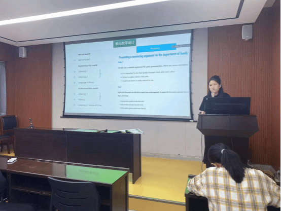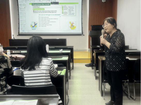 三轮示范课研讨会由教研室主任石慧老师主持。第一轮研讨会由务亚宝和黄靖雯两位老师做示范课分享。首先,务老师针对《新未来大学英语视听说1》第一单元“A better me”进行了说课展示。结合新生的特点,务老师针对第一单元5个课时的教学资源、活动设计进行了详细的汇报,尤其注重引入流行文化激发学生的学习兴趣。黄靖雯老师针对第二单元“Home sweet home”进行了教学设计分享。其中,学生小组合作、讨论、角色扮演等活动让人印象深刻。之后,教师们对于两位老师的教学设计展开了充分的讨论,并针对补充资源与教学主题的契合度、活动设计的难度、课程思政的有效性等方面提出了修改建议。