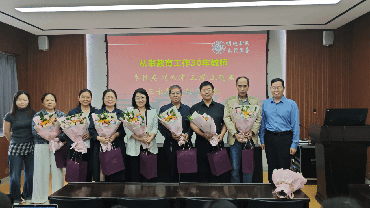 大会在庄严而热烈的氛围中拉开帷幕。会议首先向将最美好年华奉献给党的教育事业和麻豆色情 的资深教师们致敬。李桂英、刘兴沛、王博、王晓燕、王永森、于寒、于建凯等七位从教30年的教师登台,部党委书记、主任杨剑波为他们颁发了纪念品。新入职教师张露露代表全体青年教师向他们敬献鲜花,饱含深情地表达了对前辈们崇高师德和育人成就的敬意。