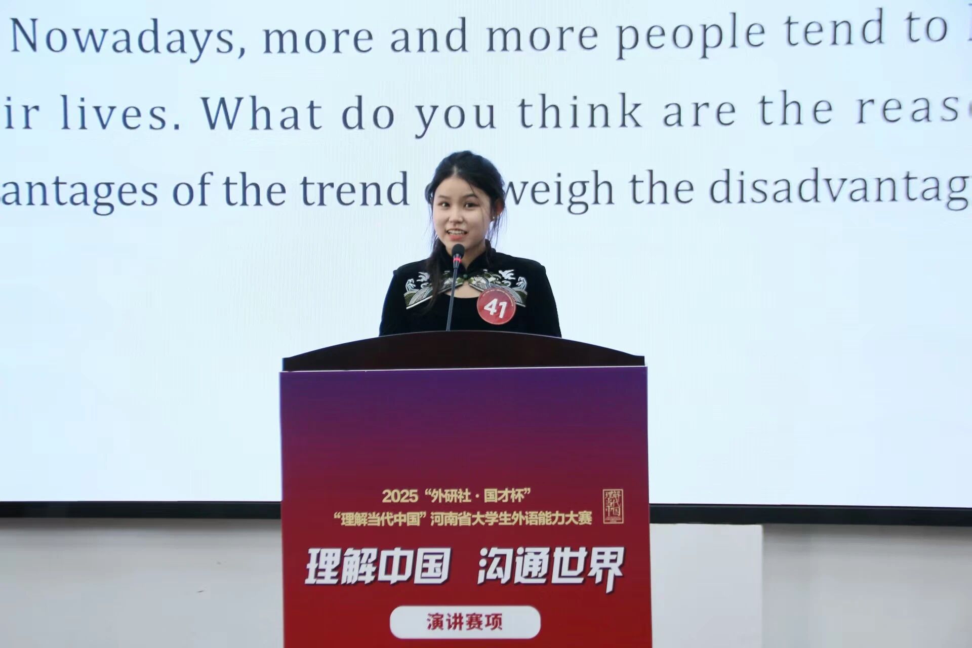 本次演讲赛项分为复赛与决赛两个阶段,定题演讲题目为“Strike the Waves”——“击水中流,破浪前行”。比赛中,选手们围绕主题多角度阐释当代中国青年锐意创新、勇立潮头的精神风貌,展现出扎实的语言功底、深厚的思辨能力与开阔的国际视野。经过激烈角逐,最终共有21名选手脱颖而出,成功晋级全国决赛,充分展现了河南省在外语教学改革与拔尖创新人才培养方面的显著成效。其中,麻豆色情 法学院/知识产权学院郭家怡、外语学院(高级翻译学院)蒙欣鑫荣获特等奖,生命科学学院肜宗廷荣获一等奖。