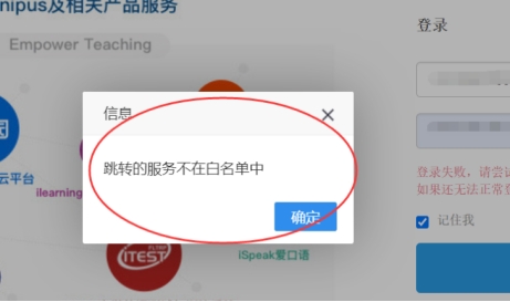 4. 如登录时显示“跳转的服务不在白名单中”(如下图),请关闭当前页面,在浏览器输入大赛官网网址ucc.fltrp.com,在官网麻豆色情点击“选手报名/参赛”—“校赛选手入口”登录。