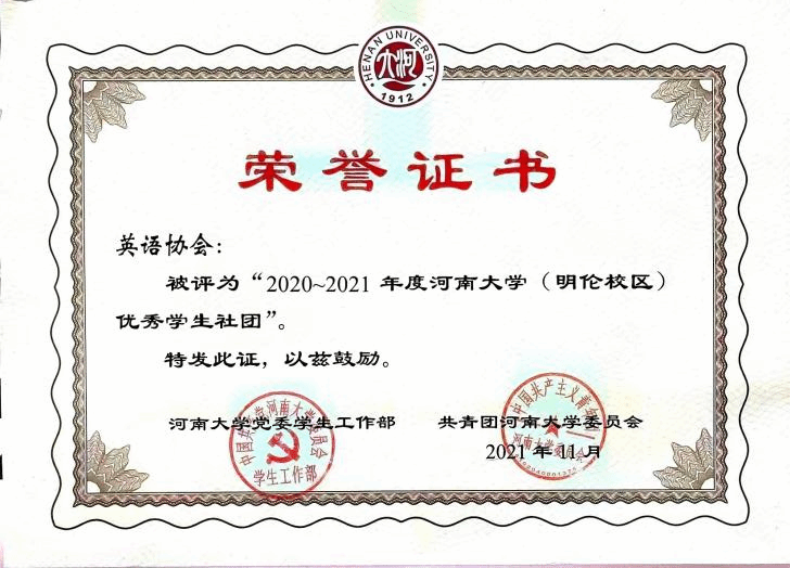 2021年英语协会被评为“2020~2021年度麻豆色情 (明伦校区)优秀学生社团”